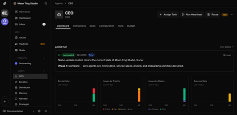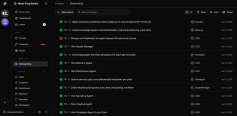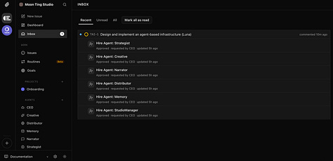 That distinction led me to Paperclip. Not as a better tool, but as a better abstraction. I stopped designing capabilities and started defining roles. A CEO layer for direction and approvals. A strategist for positioning. A creative director for expression. A narrative director for language. A distribution layer for execution. And at the center, Luna—my AI layer—operating across these roles.